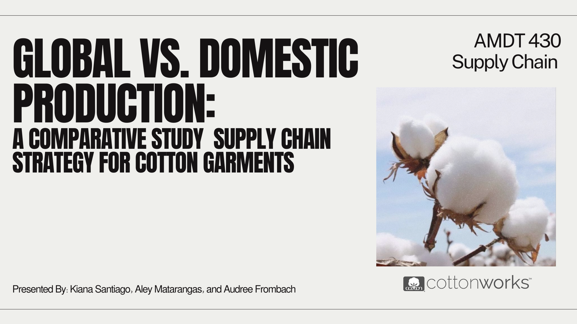 A project that tasked my group and I with developing a comprehensive supply chain strategy for two 100% cotton garments, encompassing sourcing, production, logistics, and distribution. Recognized with 1st Place Outstanding Achievement in AMDT 430: Cotton Supply Chain Project, sponsored by Cotton Incorporated.